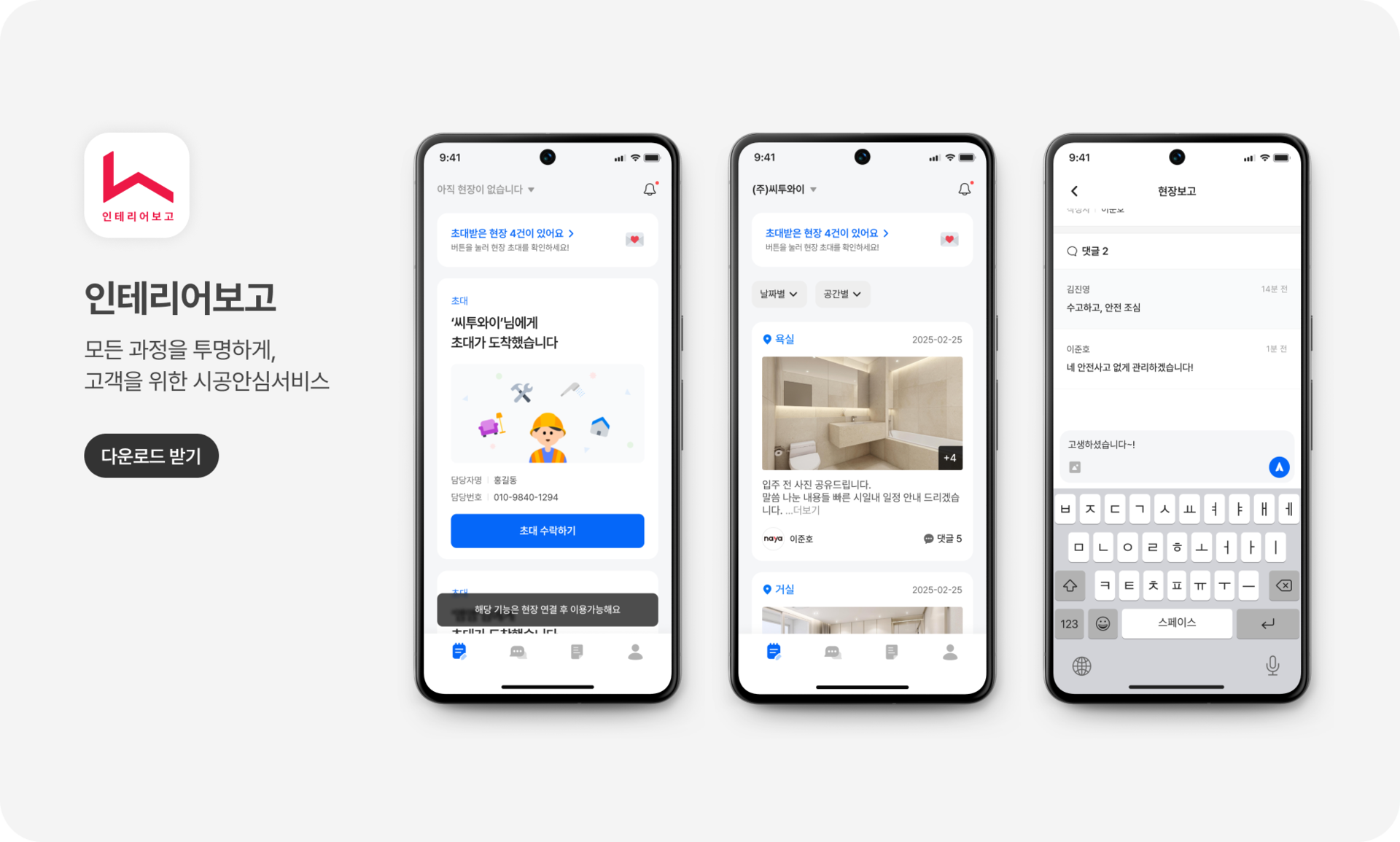 내 손안에서 확인하는 실시간 공사 현황. 전용 앱으로 공사 과정을 투명하게 보고 받고,