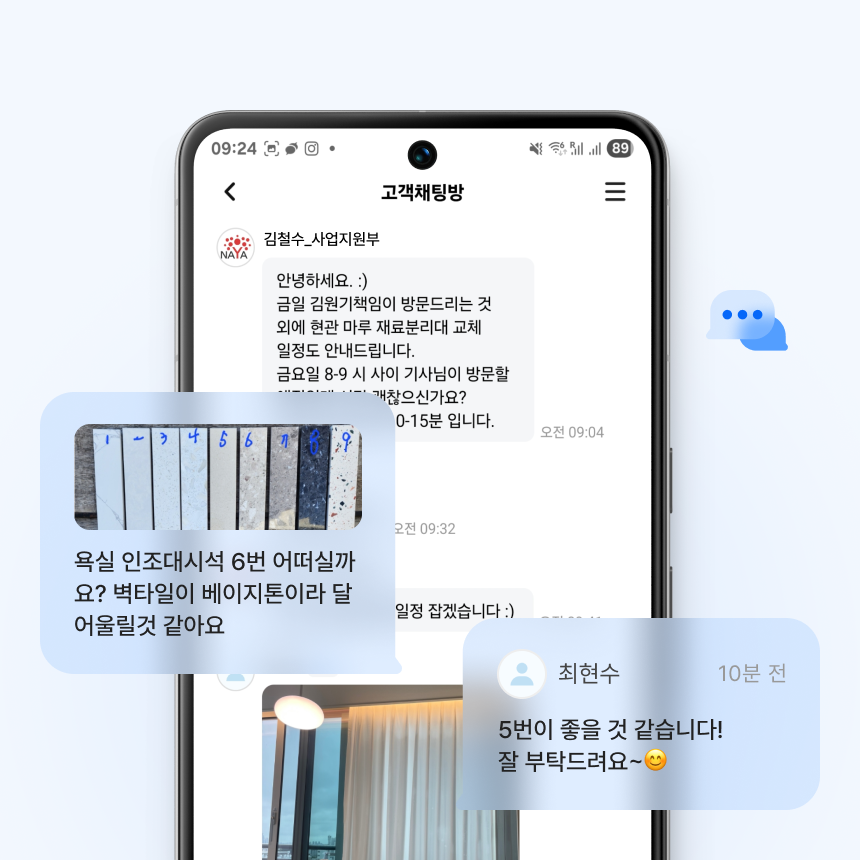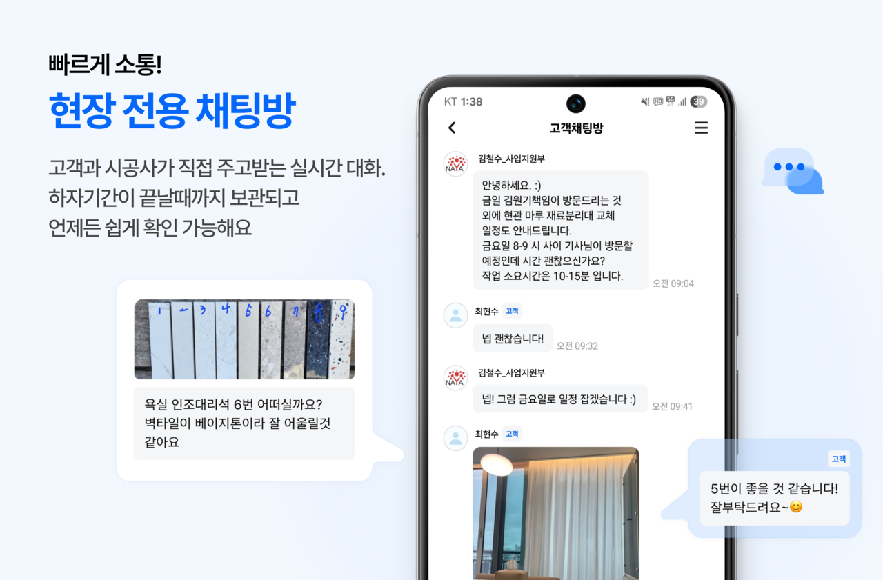 고객과 시공사가 직접 주고받는 실시간 대화.